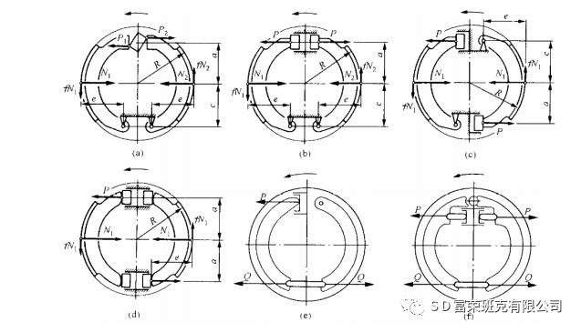 (a)領從蹄式(用凸輪張開);(b)領從蹄式(用制動輪缸張開);(c)雙領蹄式(非雙向,平衡式);(d)雙向雙領蹄式;(e)單向增力式;(f)雙向増力式