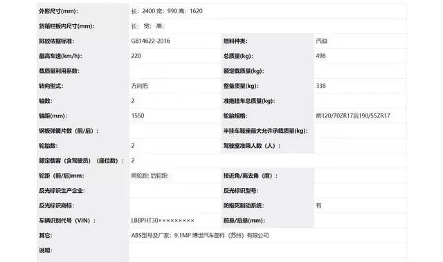 實際排量:1290cc最大功率:100Kw外形尺寸(mm):長:2400 寬:990 高:1620排放依據(jù)標(biāo)準(zhǔn):GB14622-2016最高車速(km/h):220總質(zhì)量(kg):498整備質(zhì)量(kg):338軸距(mm):1550輪胎規(guī)格:前120/70ZR17后190/55ZR17車輛識別代號(VIN):LBBPHT30×××××××××ABS型號及廠家:9.1MP 博世