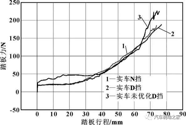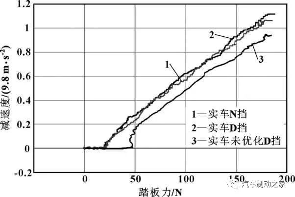 通過SPD自學習的算法應用以及實車的匹配與測試,得到車輛在不同擋位下的制動踏板感參數(shù),由于N擋驅動系統(tǒng)是切斷狀態(tài),驅動電機無法做電機制動,因此N擋可以模擬無制動能量回收工況下的制動踏板感,而D擋為驅動擋,可以得到制動能量回收工況下的制動踏板感。測試在車輛有制動能量回收和無制動能量回收下的制動踏板感,得到制動踏板感的對比如圖9—圖11所示,相比未優(yōu)化前制動踏板感覺線性度以及一致性明顯提高。