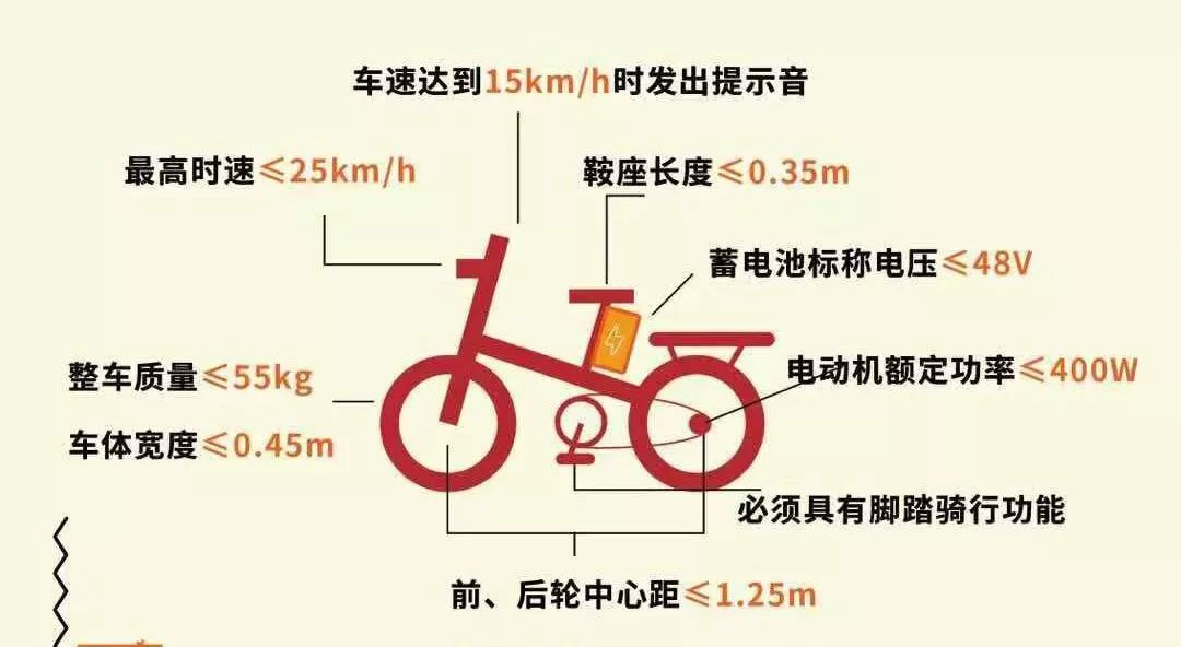 根據(jù)《電動(dòng)自行車安全技術(shù)規(guī)范》(GB17761-2018)的規(guī)定:電動(dòng)自行車是指以車載蓄電池作為輔助能源,具有腳踏騎行能力,能實(shí)現(xiàn)電助動(dòng)或/和電驅(qū)動(dòng)功能的兩輪自行車;(應(yīng)具有腳踏騎行能力,電驅(qū)動(dòng)行駛時(shí)最高設(shè)計(jì)車速應(yīng)小于或等于25km/h,電助動(dòng)行駛時(shí)、車速超過25km/h電動(dòng)機(jī)不得提供動(dòng)力輸出,裝配完整的電動(dòng)自行車的整車質(zhì)量應(yīng)小于或等于55kg,蓄電池標(biāo)稱電壓應(yīng)小于或等于48V,電動(dòng)機(jī)額定連續(xù)功率應(yīng)小于或等于400W。(號(hào)牌顏色為白色